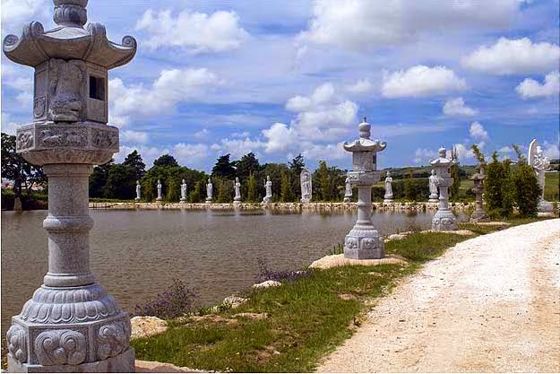 Um leão de pedra guarda a sua entrada, numa rampa que dá acesso a um moinho recuperado e a um fontanário de pedra branca, importado da China, tal como todas as estátuas. O Oriente começa uns metros mais abaixo, num passeio que pode ter início junto a um lago artificial ladeado de