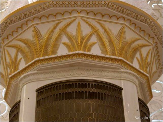 A beleza, requinte e detalhes estão presentes por toda a Mesquita, do chão ao teto, encontram-se desenhos e inscrições árabes.