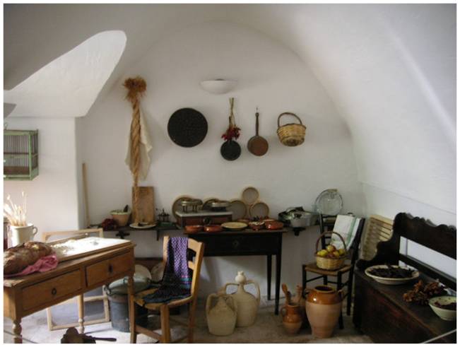 Os interiores são equipados com acessórios de madeira. Lareiras, fornos e nichos estão embutidos na espessura das paredes.