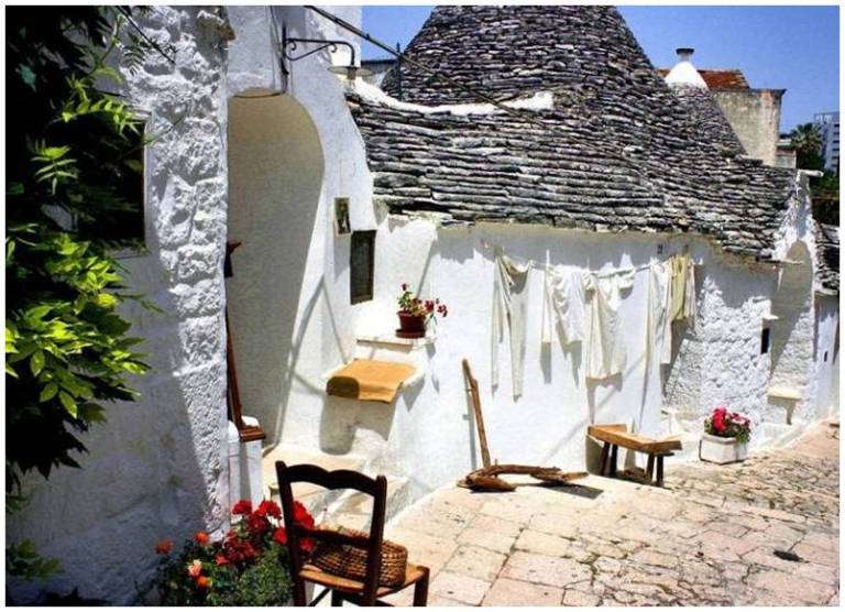A habitações são feitas de pedras sobrepostas. As paredes dos trullis são caiadas em intervalos regulares, o que dá o efeito de arredondamento dos contornos das pedras, formando uma superfície brilhante homogénea.