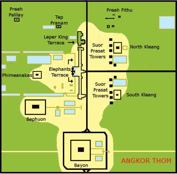 Angkor Thom, foi a última capital do Império Khmer, nela se encontravam residências fortificadas para os funcionários do palácio e militares, bem como edifícios para a administração do reino. Os Templos dentro das muralhas desta antiga cidade são Templo Bayon, Phimeanakas, Baphuon, Terraço dos Elefantes, Terraço do Rei Leproso, Prah Palilay, Pranam Tep e Prasat Suor Prat.