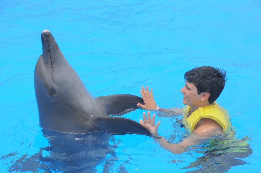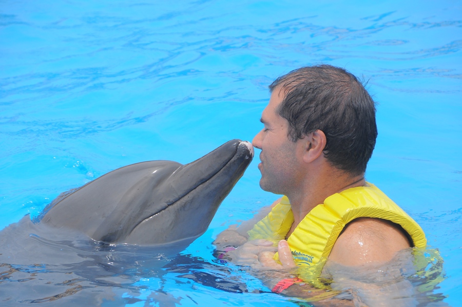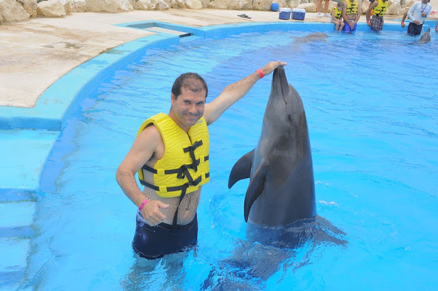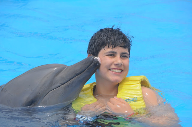 Logo no segundo dia o Pedro e o pai decidiram ir nadar com os golfinhos. O espaço dedicado para essa actividade era dentro do próprio resort. Como não sei nadar, não me atraem muito as actividades aquáticas .... pelo que preferi apenas ver. As fotos foram tiradas por fotógrafos do local.