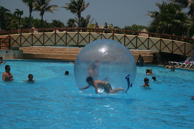 Todos os dias havia atividades junto à piscina, uma dessas atividades consistia em andar sob água dentro de uma bola de plástico. O meu Pedro foi o vencedor com o tempo mimimo. O prémio foi uma t-shirt com o logotipo do hotel.