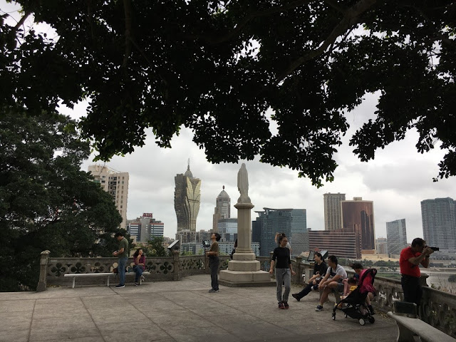 Quando lá chegamos ficamos logo impressionados com a magnifica vista panorâmica que dali se desfruta. Aqui podemos ver a Torre de Macau e a Ponte que liga Macau à ilha da Taipa.